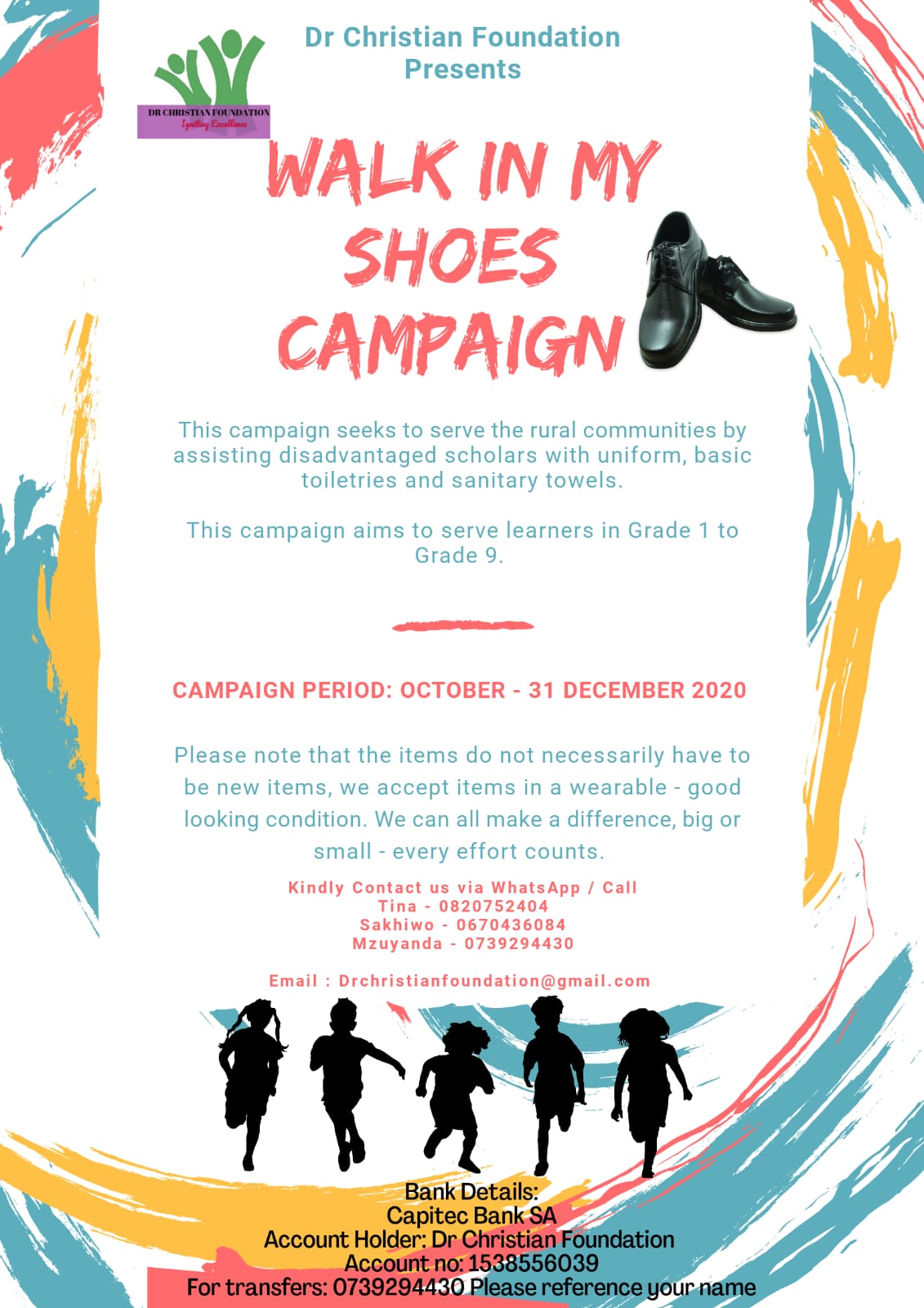 Events Upcoming Events 2021 Delivery of school shoes When: March 2021 Tertiary application assistance When: June/July 2021 Kick-start walk in my shoe campaign for 2022 When: September 2021 Soccer & netball tournament When: December 2021 Campain 2021 DR Christian Campaign Posters